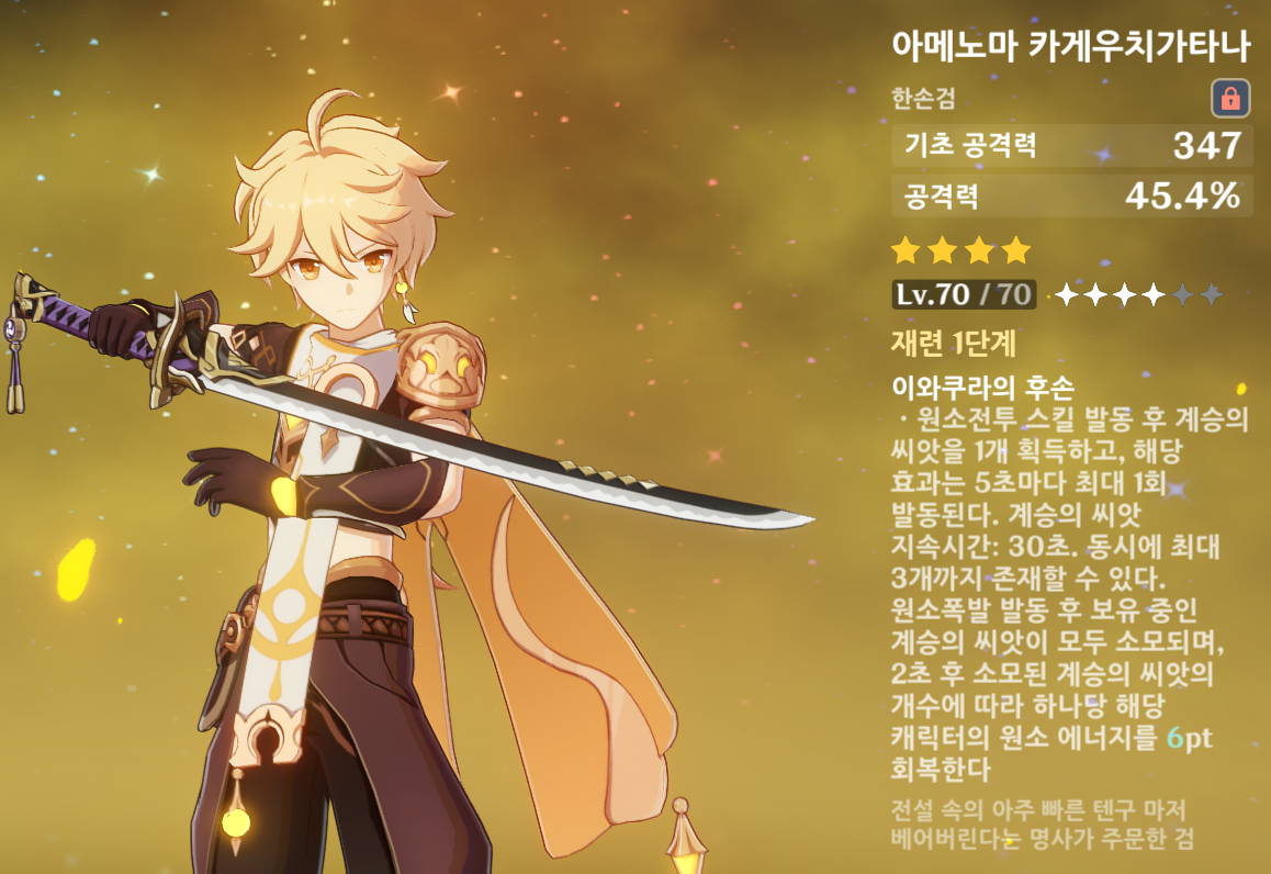 4성 단조 무기인 아메노마 카게우치가타나가 외형이나 성능적으로 아야카와 잘 맞는다.
