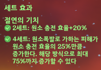 이외에는 원소 폭발에 초점이 맞춰진 캐릭터이기 때문에 원소 폭발 중심적인 캐릭터로 활용하기 위해서는 절연 4세트가 가장 좋은 선택이 될 것으로 보인다.