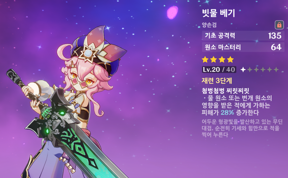 다만 풀 원소와 함께 사용하기 좋은 캐릭터일 것으로 판단되므로, 풀원소 반응시 중요한 빗물 베기가 도리에게 좋은 무기가 될 것이다. 도리가 있는 이상 X물 베기는 아니다. 대신 원소 충전을 성유물에서 많이 챙겨줘야 한다.