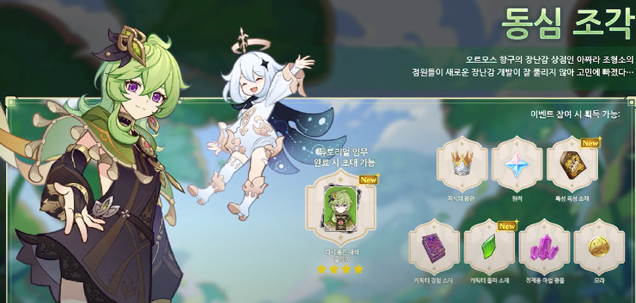 동심 조각을 통해 바로 콜레이를 얻을 수 있기 때문에 풀 원소 캐릭터를 3.0에 맞춰서 사용해 볼 수 있도록 배려가 있는 것으로 판단된다. 콜레이는 기존에 캐릭터리뷰를 했었지만, 4성 딜러로 나쁘지 않을 성능을 보여주는 것을 확인된 만큼 3.0 초반에 재미있게 즐길 수 있을 것으로 기대된다.