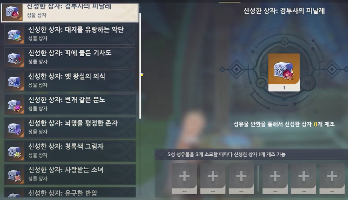 이외에도 기존에는 성유물 변환에 제한이 있었는데, 이나즈마 이전 버전인 1.2 버전까지 나온 성유물로 확대되었다.