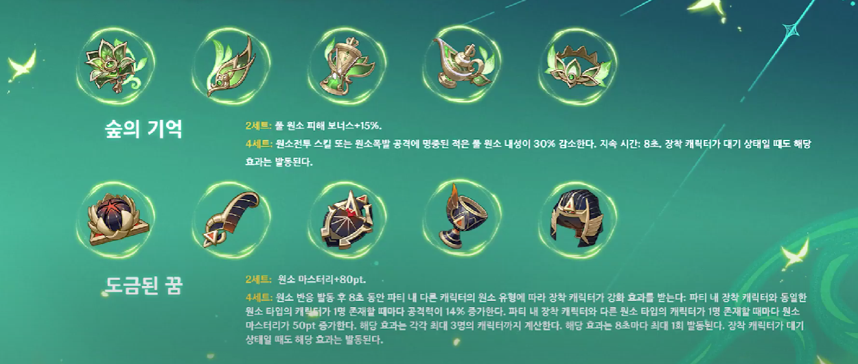 3.0에 경험할 수 있는 신규 성유물은 2가지로, 풀원소 캐릭터들이 사용할 수 있는 숲의 기억과 원소 마스터리를 보다 높게 올려줄 수 있는 도금된 꿈이다. 도굼된 꿈을 보자마자 카즈하, 야에 미코가 생각이 난다.