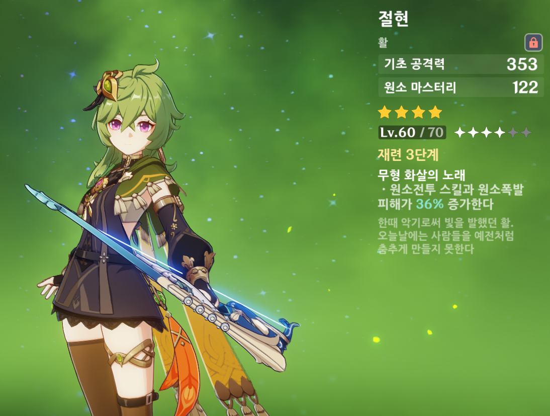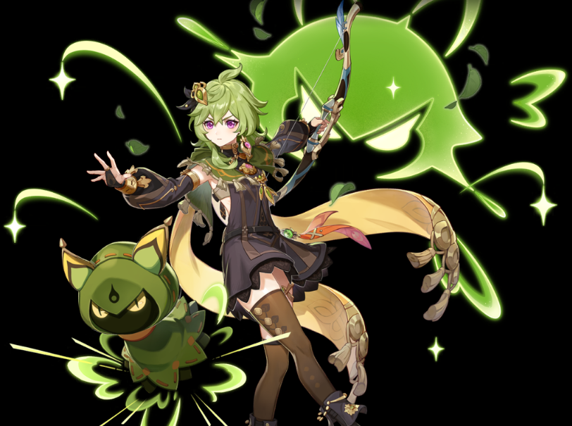 원소 폭발 3초를 늘려주는 특성을 통해 총 9초간 풀 원소 반응을 할 수 있는 부분과 되돌아오는 잎새로 근거리 풀 원소 반응이 좋은 캐릭터라고 할 수 있다.