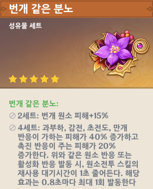 번개 같은 분노 4세트로 이를 이용해서 원소 반응 피해 증가는 물론, 촉진 반응의 피해도 증가되며 원소 전투 스킬을 보다 빠르게 사용이 가능할 것으로 기대된다.(기본 7.5초인데 더 줄이면, 와우!)