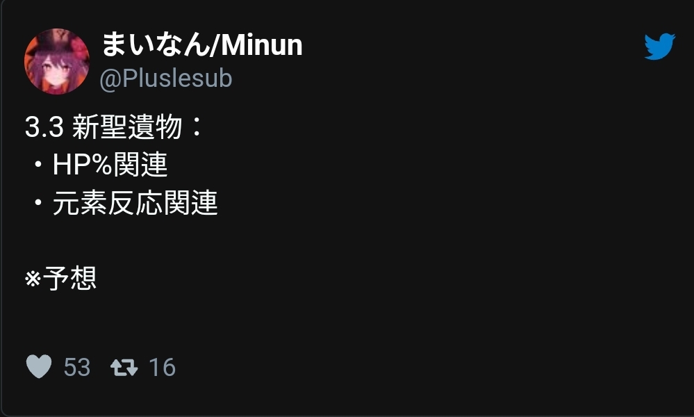 @Pluslesub는 트위터로 3.3에 HP관련 성유물과 원소 반응 성유물이 나올 것이라고 메세지를 알렸다.