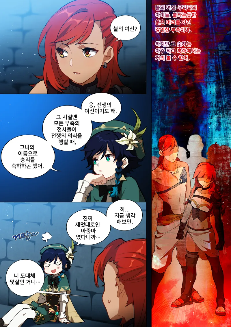 원신 코믹스에서 벤티가 무라타라는 전쟁의 여신이 불의 여신이라고 한다. 즉 불의 신은 여성 캐릭터이라는 점은 확실한 사실이라고 할 수 있다.