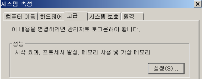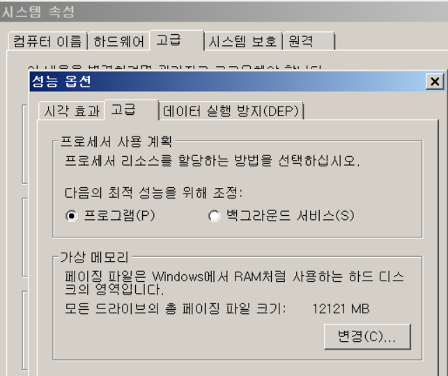 고급 시스템 설정에 성능 부분을 통해 현재 설정된 가상메모리를 해제하거나 수동으로 관리할 수 있다.