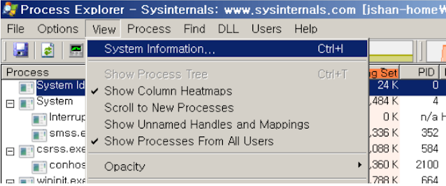윈도우에서 가상 메모리를 확인하는 방법은 기본 작업 관리자로는 조금 어려움이 있다. 따라서 process explorer라는 도구를 이용하면 보다 쉽게 확인이 가능하다.