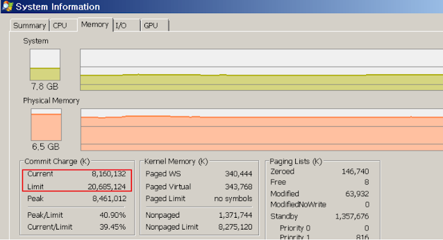 메모리 탭에서 확인해보면 Commit Charge라고 보이는 부분이 바로 가상 메모리이다. 용어가 완전 다르게 표현되지만, 기본적으로 현재 가상메모리의 최대 크기와 사용량을 확인할 수 있다.