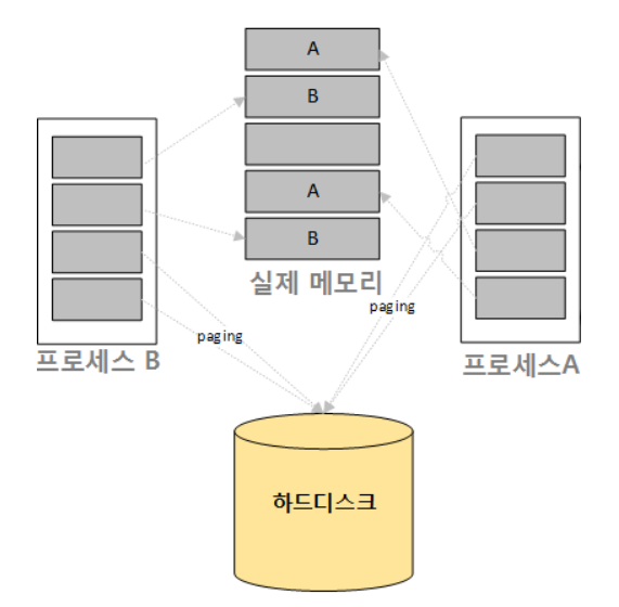 윈도우와 리눅스 모두 부족한 메모리를 위해 페이징(paging), 리눅스에서는 스왑(swap)을 통해 부족한 메모리를 보조저장장치인 하드 디스크를 사용하게 된다.