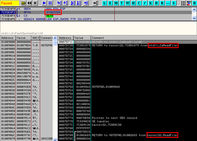 BOOL WINAPI ReadFile() > kernel32.ReadFile() > ntdll.ZwReadFile() > ntdll.KiFastSystemCall() > SYSENTER > nt!NtReadFile() > 처리 > 처리 결과 리턴