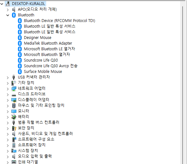 이후 알 수 없는 USB 장치가 없어지고 정상적으로 블루투스 장비로 설정된 것을 알 수 있다.
