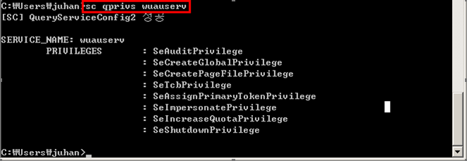그리고 현재 실행 중인 서비스가 필요로 하는 특권은 아래와 같이 Sc 명령을 통해 확인할 수 있다. 이렇게 필요 특권을 확인하여 서비스 그룹을 선택하는것도 좋은 방안이 될 수 있다.