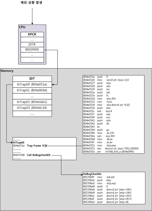 윈도우에서는 IDT(Inturrupt Descriptor Table)를 이용해 인터럽트 및 예외(Exception)를 처리하는데, BSOD와 같은 예외 상황 역시 IDT 테이블 통해 처리되며, 최종 KeBugCheckEx를 통해 오류상황에 대처한다. 그럼 KeBugCheckEx의 구조체를 알아보자.