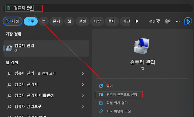 드라이버 관리는 컴퓨터 관리에서 확인할 수 있다. 시작에서 컴퓨터 관리를 입력해서 관리자 권한으로 실행한다.
