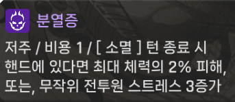 괴물을 받아들인다: 저주카드(분열증) + 선택 전투원 1회 번뜩임