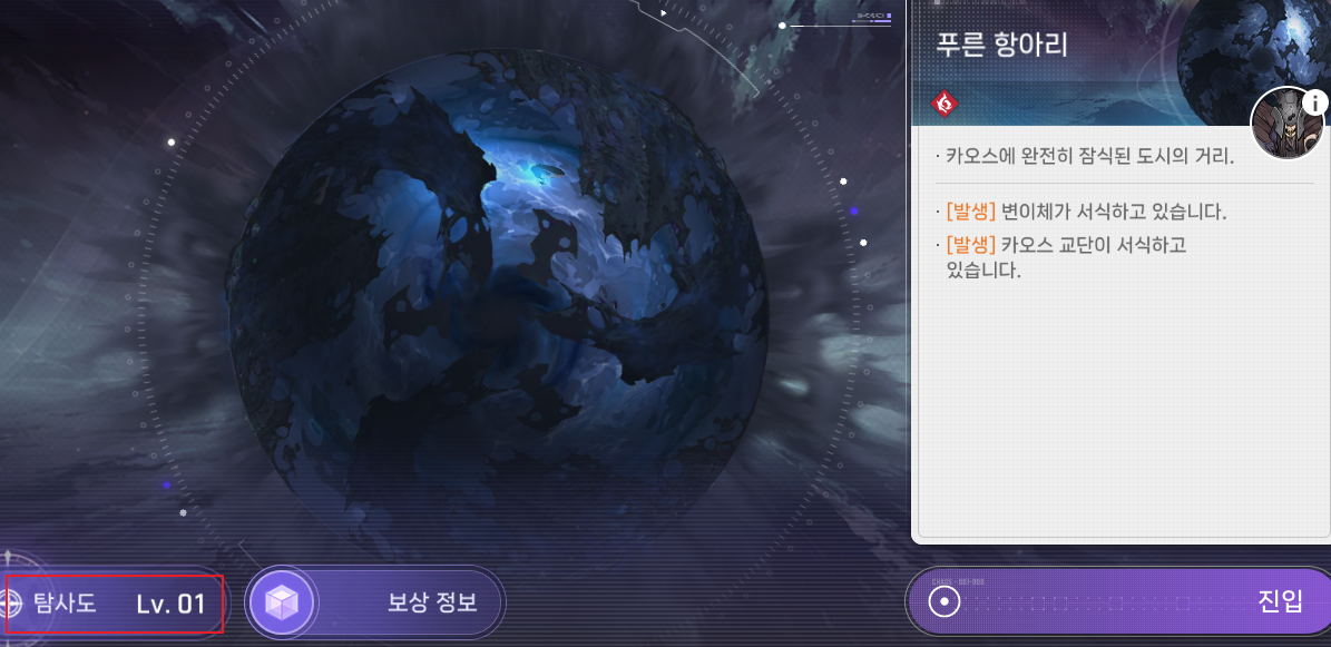 각 카오스 행성에는 미리 던전에서 확득할 수 있는 장비와 이벤트, 보스등을 확인할 수 있다.