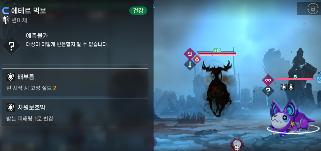 에테르 먹보는 공격을 하지 않으면, 도망치기를 시작하지 않기 때문에 먼저 다른 적을 제거한후에 집중 공략하는 방식으로 진행하는 것이 좋다. 무조건 피해가 1로 고정되어 있어서, 다단 히트 형태의 캐릭터가 유리하다.