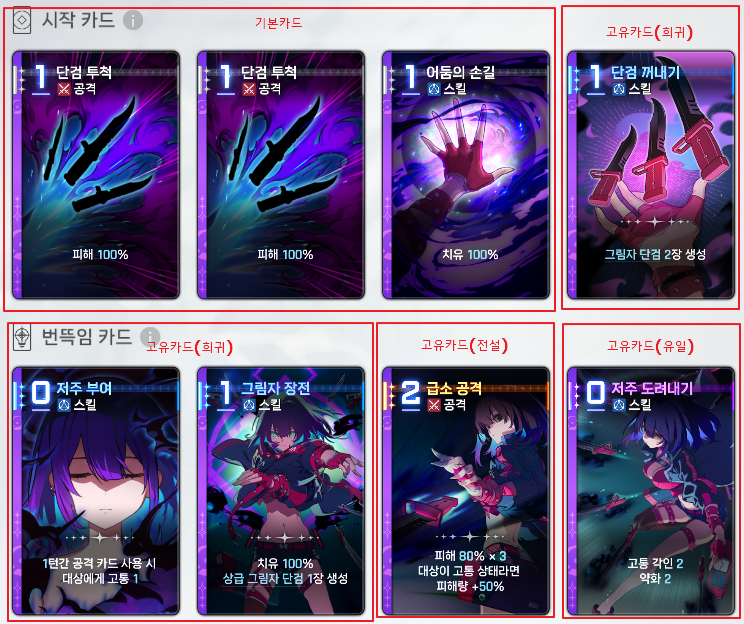 시작 카드란 카오스 던전을 시작할때 기본적으로 가지고 있는 카드를 말하고 4장을 가지고 시작한다. 이후 번뜩임을 통해 나머지카드를 획득 할 수 있다.