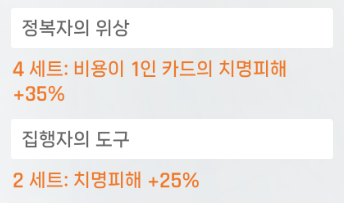 그리고 1코스트 인 카드가 많기 때문에, 정복자의 위상이 가장 효율이 좋은 세트 장비이다.
