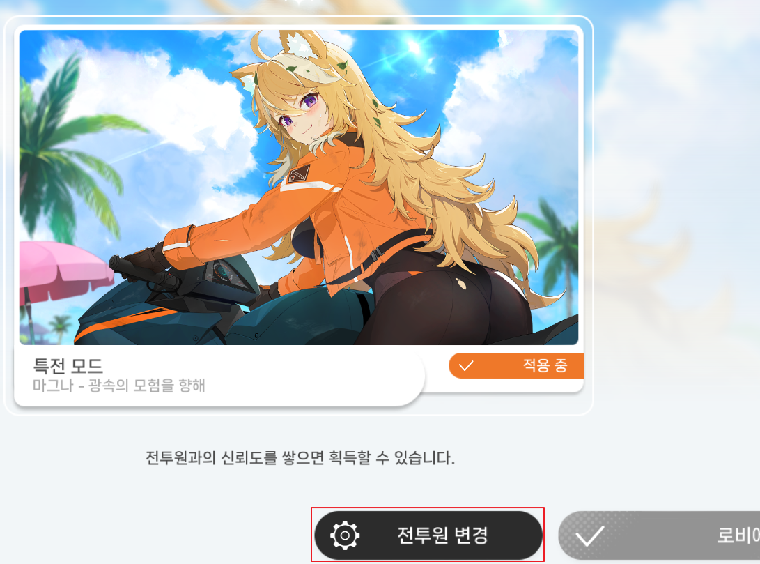 이후 오른쪽에 기본적으로 레노아 특전 모드가 비활성화 되어 있는데, 여기에 전투원 변경을 통해서 자신이 해금한 전투원의 특전 배경을 선택할 수 있다.