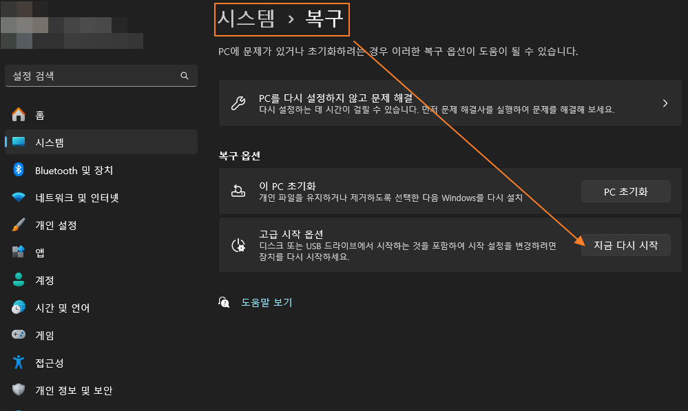 시스템 → 복구 를 통해 확인된 고급 시작 옵션을 이용해서 시스템을 다시 시작하면,