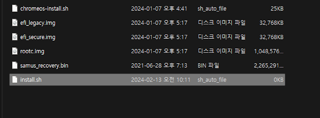 이제 거희 마무리 되었다. 이미지 이름을 보기 좋게 변경해주고, chromeos-install.sh를 사용하기 위해서 pv, cgpt를 설치해야 하기 때문에 install.sh 파일을 만들어두면 유용하다. 그리고 chromeos-install.sh 를 실행하는 명령을 넣어두어서 복사해서 사용하도록 하자.