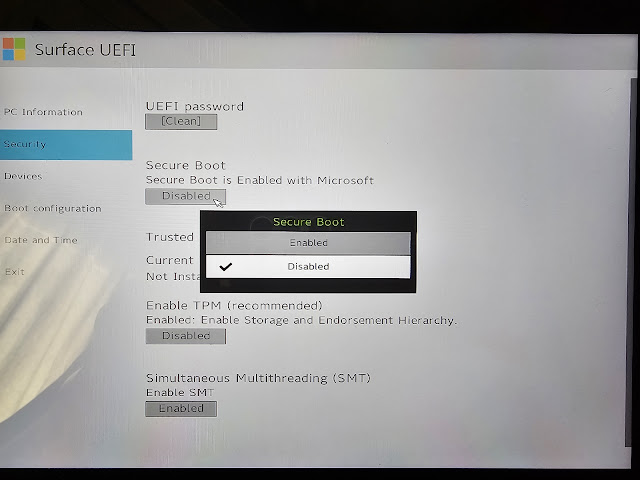 BIOS 설정에서 반드시 진행해야 하는 부분은 바로 Secure Boot 옵션 비활성화이다. 현재는 대부분의 장비가 지원하기 때문에 이를 비활성화 하기를 추천한다.