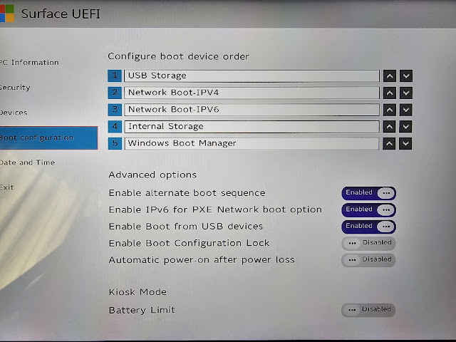 추가로 서피스 기준으로 Internal Storage보다 Windows Boot Manager가 위에 있어야 Volume Down + Power Key를 통해 USB 부팅이 가능하다.