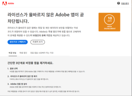 Adobe 측과의 네트워크 연결을 차단하는 것으로 임시 방편을 사용할 수 있다.