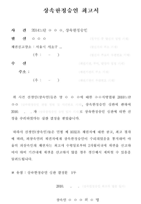 2. 본 발신인(이하 '상속인')은 망 000의 상속인으로서, 00가정법원 0000 0000 호 상속한정승인 심판에 관하여 2000. 00. 00.자로 한정승인 신청이 수리되었다는 심판 결정을 받았음을 알려드립니다.
