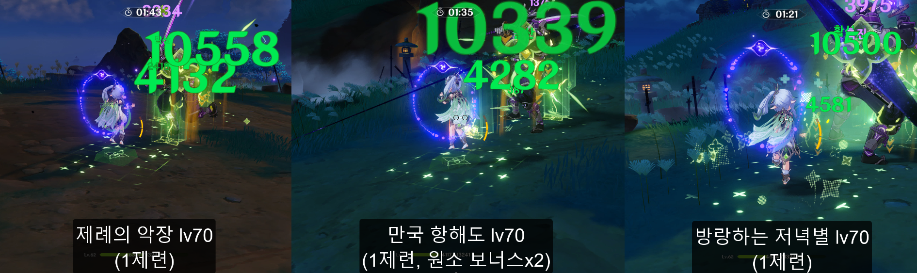 아래는 70레벨로 간단히 비교해본 피해량 수치이다. 동일한 성유물에 무기만 바꿔서 테스트해본 결과 원소 마스터리가 높은 제례의 악장이 가장 높은 것으로 나타났다.