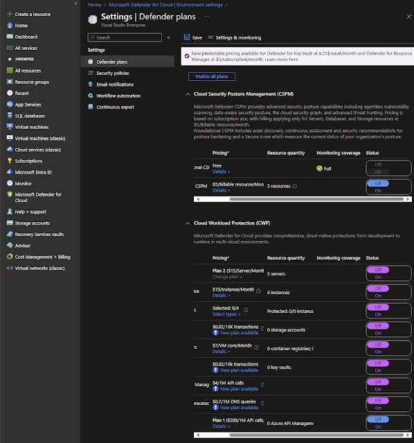 Microsoft Defender for Cloud 는 Azure 서비스들을 보호하는 기본 구성 요소중 하나다 보니, 자연스럽게 활성화가 되어 있을 것이다. 이를 아래 처럼 모두 비활성화를 진행하면된다.