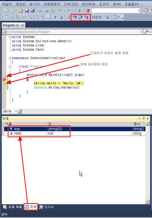 그럼 한 단계씩 코드를 실행(F11키) 버튼을 눌려 string Hello = "Hello, C#"; 를 실행해 보자. 아래 그림과 같이 실행중인 위치가 바뀌고, Hello 변수에 값에 우리가 입력한 "Hello, C#"이 들어간 것을 확인할 수 있다.
