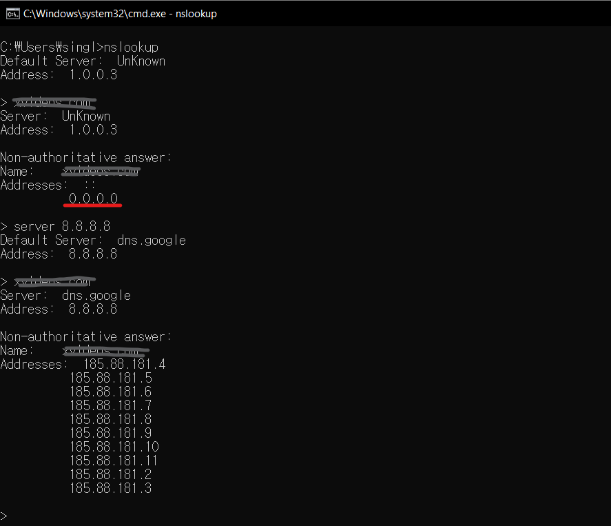 정확한 비교를 위해 nslookup을 이용하여 확인해 본 결과, 차단 도메인의 경우, 0.0.0.0 으로 회신하는 것을 알 수 있다.