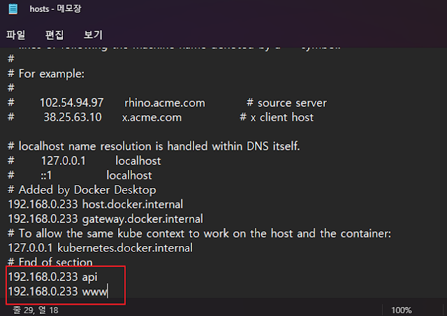 만약 도커를 실행하지 않는 개발중에 위와 같이 호스트 이름으로 호출하고 싶다면. hosts 파일을 이용하자.