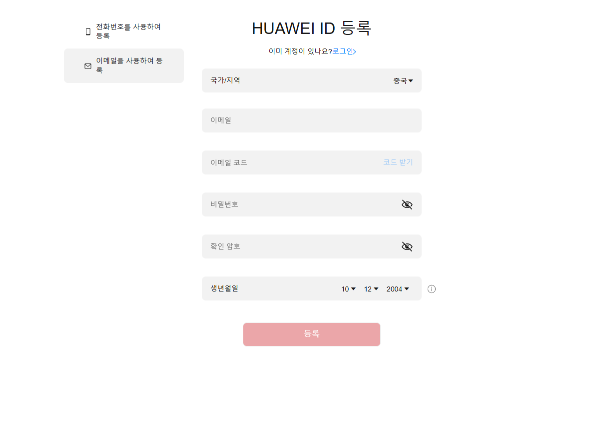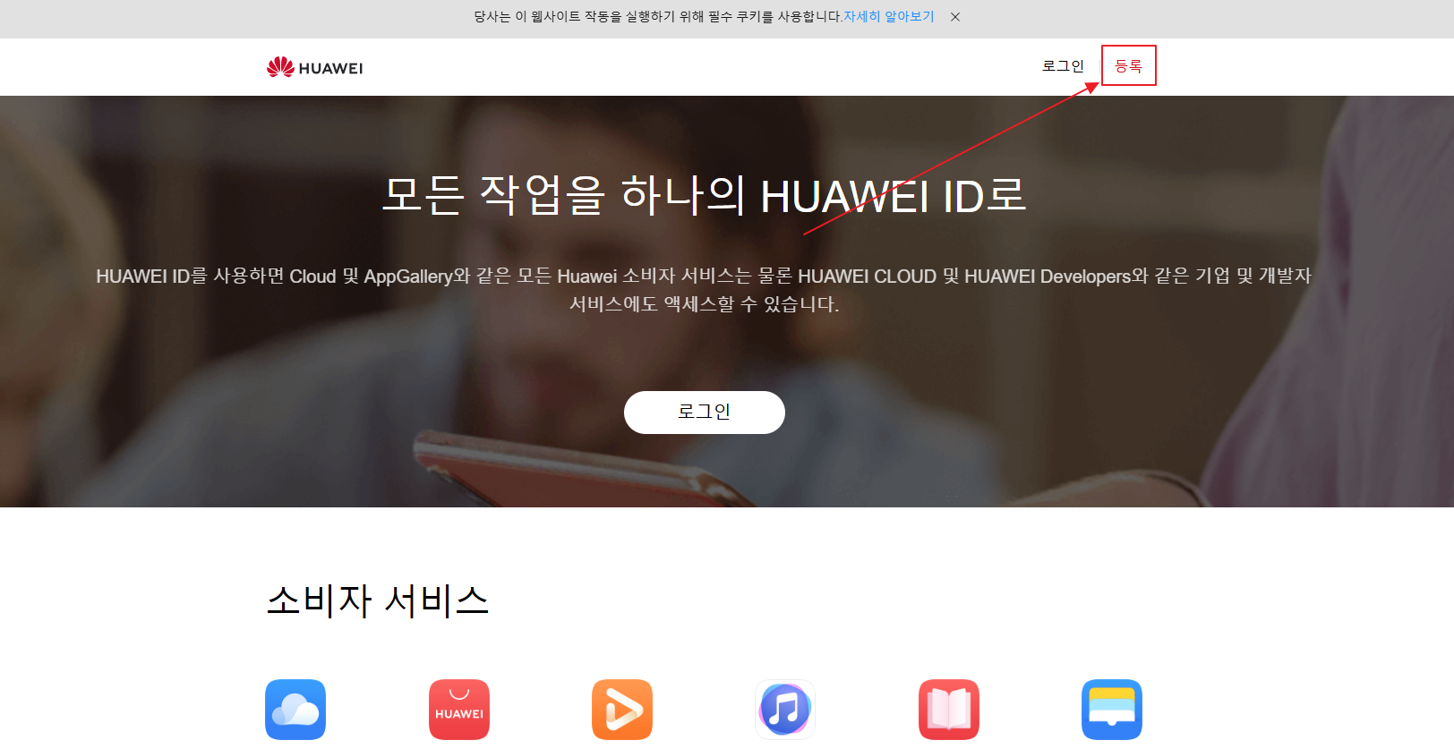 홈페이지에 들어가서 등록을 누르면 동일한 Huawei ID 생성이 가능하다. 핸드폰과 다르게 노트북이기 때문에 별도의 모드 지정없이 가입을 진행하면 된다. 이때 지역을 중국으로 하는 것을 잊지 말자.