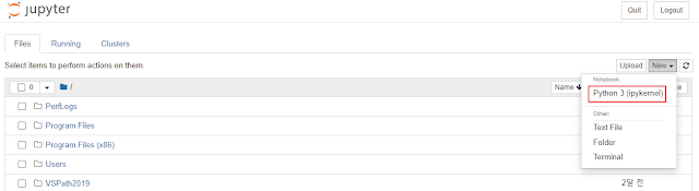 NoteBook 파일을 폴더에 모아서 관리하고자 한다면, New -> Folder를 통해 신규 폴더를 생성할 수 있는데,