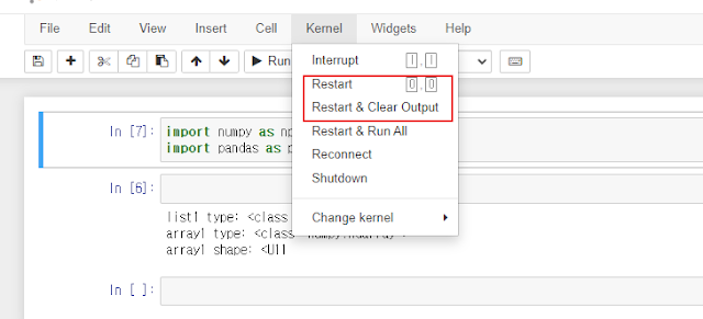 만약 너무 많은 코드 라인을 실행하였거나, 메모리에 너무 많은 데이터를 로드하여 문제가 있는 경우 Restart등을 통해 개발 환경을 초기화 할 수 있어, 유용하다.