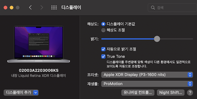 기존에 맥북을 사용하다가 MAC M1으로 교체하면서 모니터 색상이 기존과 다르다는 느낌을 받았다. 환경 설정의 디스플레이로 가보면, MAC M1의 경우 Apple XDR Display로 기본 설정이 되어 있는 것을 알 수 있었다.