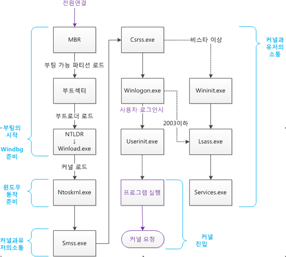 위 그림은 윈도우 부팅 과정중 중요 부분을 순차적으로 표현한것으로 각 단계들을 자세히 살펴 볼것이다. 부팅 단계에 유저 모드(사용자들이 응용프로그램을 실행하는 작업 공간)와 밀접한 윈도우 핵심 부분들이 많이 들어가 있다. 이를 통해, 시스템 프로세스들을 이해하고 상호 연관성을 이해하는 데 도움이 될 것이다.