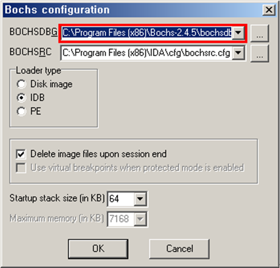 모든 설정을 완료하였다면 이제 Bochsdbg.exe의 경로를 지정하면 끝이다. 단 IDA Pro 6.0 이하 버전이라면 Bochsdbg 실행 파일의 위치를 지정이 올바른지 Debugger setup 메뉴의 Set specific options을 통해 확인해 보도록 하자.