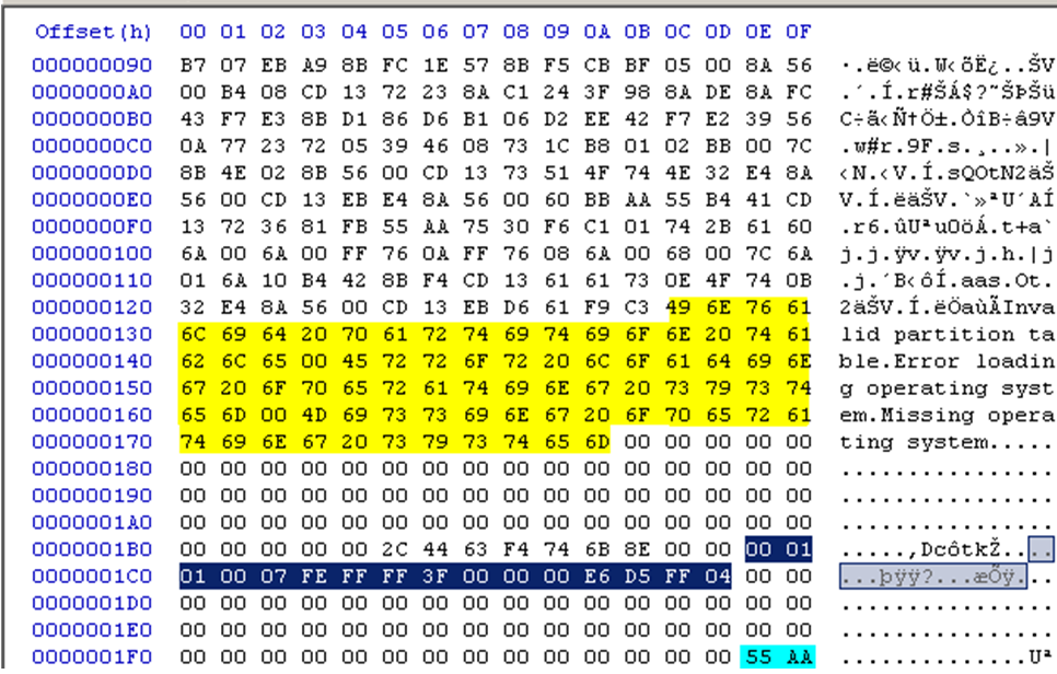 그리고 아래 0x0000001BE부터 0x0000001CD까지 첫 번째 파티션 영역에 대한 내용으로, 이 부분을 조금더 자세히 확인해 보자.