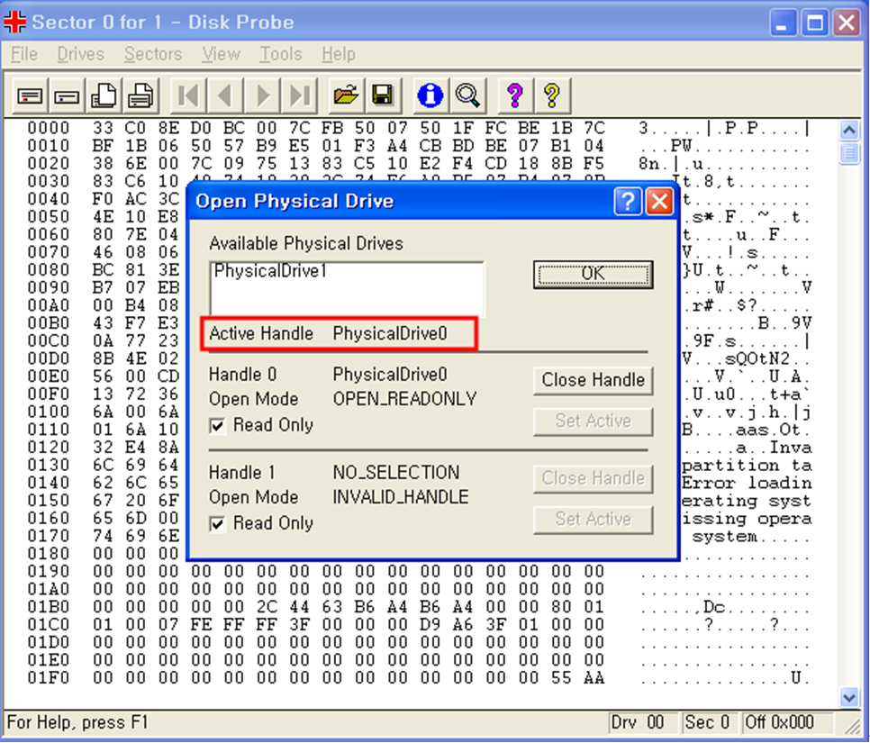 현재 컴퓨터에서 DiskProbe를 실행한 후, Drive -> Open Physical Drive 메뉴를 선택하고, MBR 영역이 존재하는 디스크를 마우스 더블 클릭으로 선택한 이후 Set Acitve 메뉴를 눌려 디스크를 활성화한다.