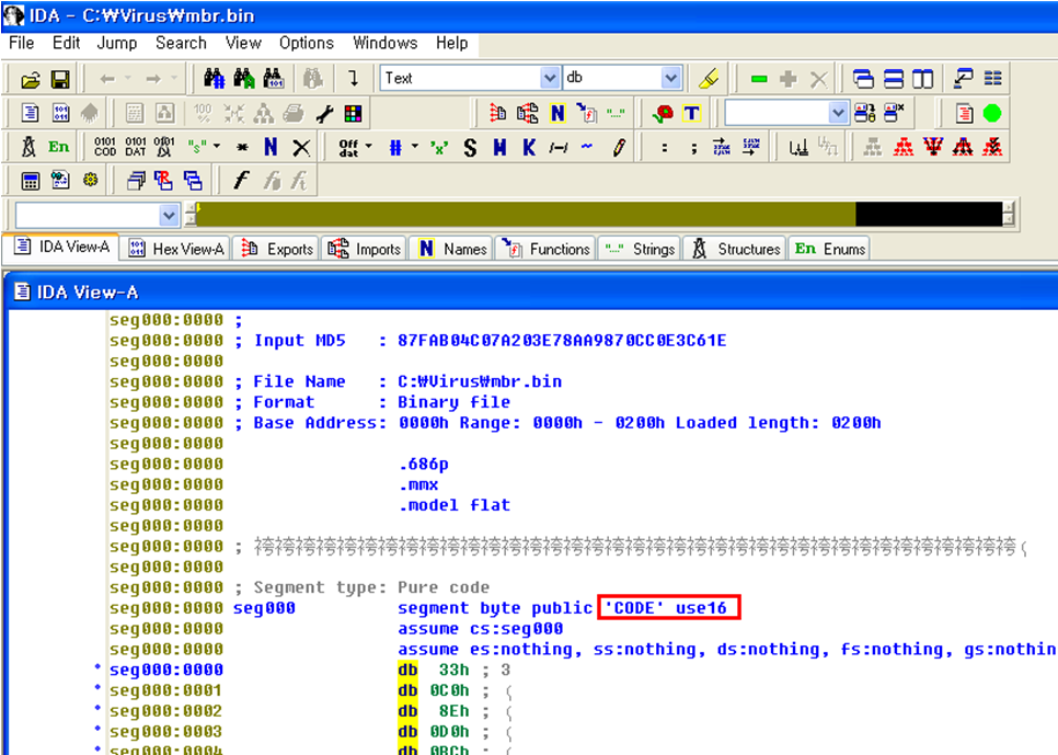 그럼 이제 MBR 영역을 바이너리 파일로 추출하여, 이를 IDA에 연결한 후 코드 분석을 진행해 보자.