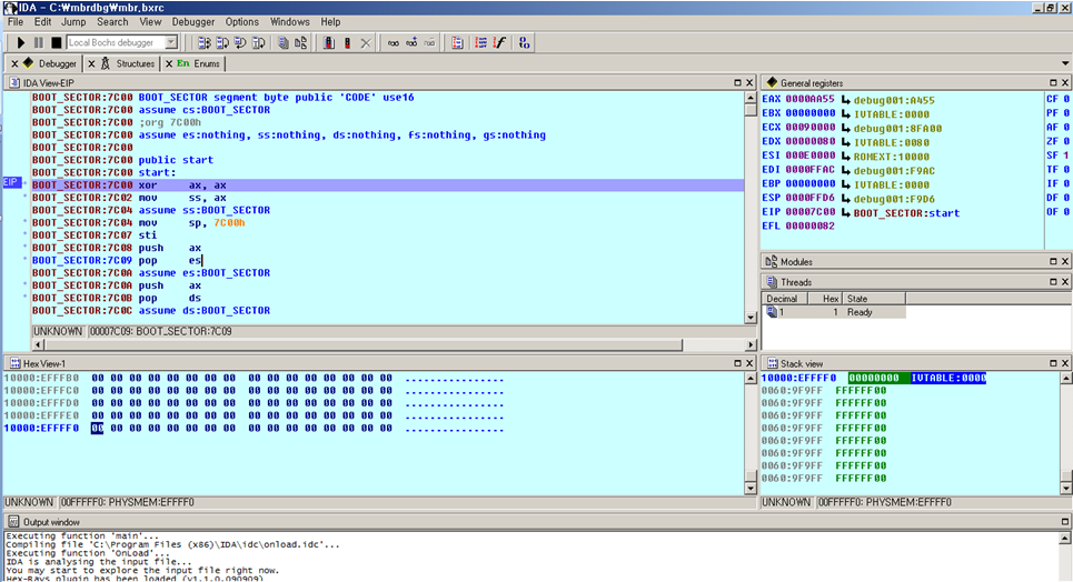 이와 같은 구성은 악성코드 및 응용프로그램을 Bochs가 제공하는 가상화에서 분석을 진행할 때에도 용이하므로 사전에 Bochs와 연동이 가능하도록 IDA를 구성해 놓으면 편리하다.