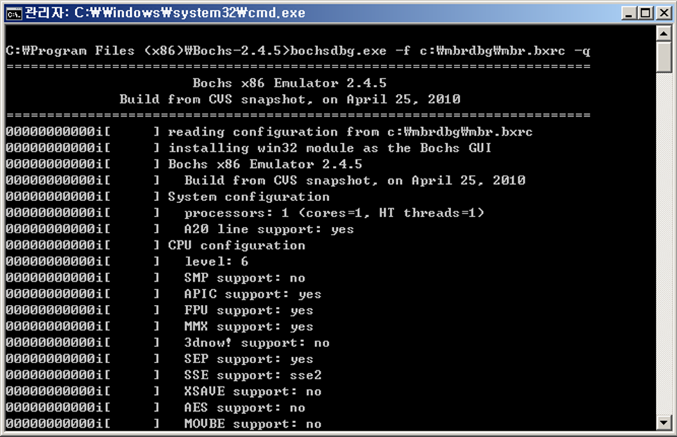 bochs dbg –f “확인하고자하는가상머신” -q