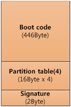 위 그림과 같이 MBR 영역은 부트 코드(Boot code)와 파티션 테이블(Partition Table), 그리고 시그니처(Signature)로 구성되어 있다.