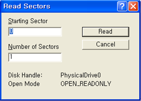이후 Sector -> Read 메뉴를 통해서 첫 번째 섹터를 읽어들인 후 해당 섹터를 디스크에 저장하도록 하자.