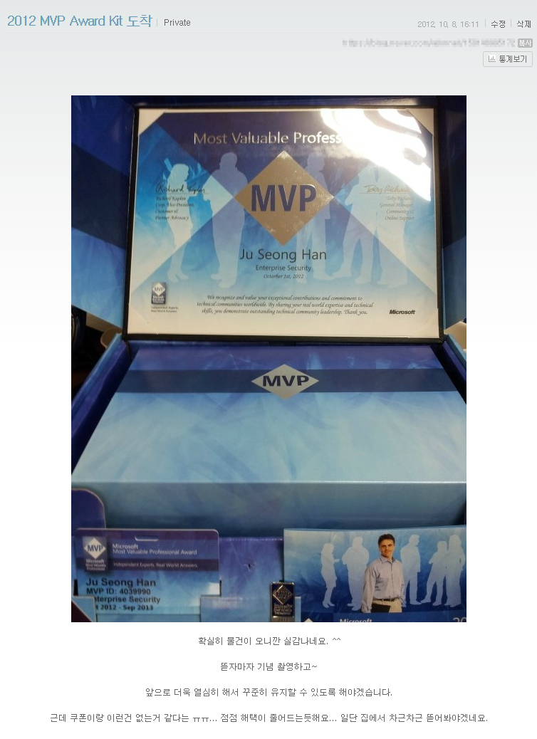 오랫만에, 과거 Naver에 비공개로 남겨둔 자료들을 살펴보다, 처음 MVP를 수상했던 포스팅을 보았다.